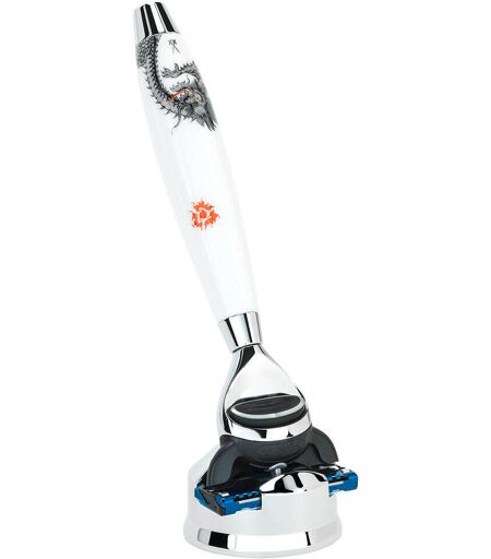 Deze serie is de kroon op het totaalprogramma van MÜHLE. Volumineuze vormen en een expressief silhouet worden gecombineerd met het puristische designprincipe dat typisch is voor MÜHLE. De resulterende proporties benadrukken de waarde en schoonheid van de gebruikte materialen: carbon, Meissen-porselein en moeraseik/sterlingzilver. Deze meesterwerken worden gemaakt met het fijnste handmatige precisiewerk: van de productie van de uitschroefbare borstelkop, het polijsten van de metalen onderdelen tot het coaten van de oppervlakken en de productie van de greeplichamen. Elk van deze kostbare unieke stukken wordt op bestelling gemaakt en wordt geleverd met een geïllustreerd boekje in een hoogwaardige presentatiedoos. Het materiaal - Meissen porselein De handvatten van deze EDITION zijn gemaakt van puur Meissen-porselein. Hun decoratie, de Chinese Ming-draak, toont de beroemdste schildering van die gerenommeerde manufactuur. Met de hand gemaakt door meester-ambachtslieden en minutieus beschilderd met een zeker gevoel voor detail, zijn de elegante handvatten waarschijnlijk een van de mooiste dingen die MÜHLE ooit heeft geproduceerd. En de draak? Een symbool van mannelijke energie - dag na dag, dinsdag en zondag. Van het recept van het gloeiende rood (de kleur van geluk, trouwens) tot de glazuurtechniek, dit patroon bevat de ervaring van vele, vele generaties. Bij de hals en de basis van elk handvat zet een ring van verchroomd metaal prachtige accenten. De scheerkop - Gillette® Fusion Zacht, veilig en betrouwbaar: De vijf gestapelde mesjes van Gillette® Fusion™ zorgen voor een voorzichtige en gladde scheerbeurt die ook zacht is voor de huid. Een mesje dat iets verder naar buiten zit zorgt voor precieze contouren, comfortmesjes voor een nog gladder resultaat. Dit systeem is ideaal voor nieuwkomers dankzij de eenvoudige en veilige bediening en is overal in de winkel verkrijgbaar. Alle MÜHLE scheerapparaten in dit systeem zijn ook compatibel met SkinGuard, de nieuwste ontwikkeling van Gillette®. Als Gillette® Trusted Partner gebruikt MÜHLE alleen originele accessoires. ( Originele onderdelen van Gillette® ) ...