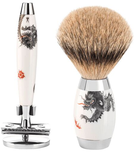 Deze serie is de kroon op het totaalprogramma van MÜHLE. Volumineuze vormen en een expressief silhouet worden gecombineerd met het puristische designprincipe dat typisch is voor MÜHLE. De resulterende proporties benadrukken de waarde en schoonheid van de gebruikte materialen: carbon, Meissen-porselein en moeraseik/sterlingzilver. Deze meesterwerken worden gemaakt met het fijnste handmatige precisiewerk: van de productie van de uitschroefbare borstelkop, het polijsten van de metalen onderdelen tot het coaten van de oppervlakken en de productie van de greeplichamen. Elk van deze kostbare unieke stukken wordt op bestelling gemaakt en wordt geleverd met een geïllustreerd boekje in een hoogwaardige presentatiedoos. Het materiaal - Meissen porselein De handvatten van deze EDITION zijn gemaakt van puur Meissen-porselein. Hun decoratie, de Chinese Ming-draak, toont de beroemdste schildering van die gerenommeerde manufactuur. Met de hand gemaakt door meester-ambachtslieden en minutieus beschilderd met een zeker gevoel voor detail, zijn de elegante handvatten waarschijnlijk een van de mooiste dingen die MÜHLE ooit heeft geproduceerd. En de draak? Een symbool van mannelijke energie - dag na dag, dinsdag en zondag. Van het recept van het gloeiende rood (de kleur van geluk, trouwens) tot de glazuurtechniek, dit patroon bevat de ervaring van vele, vele generaties. Bij de hals en de basis van elk handvat zet een ring van verchroomd metaal prachtige accenten. De borstelkop - dassenpluk met zilveren punt Een beproefde klassieker en de onbetwiste top van het natuurhaarassortiment: Silberspitz Dachszupf is bijzonder zacht en flexibel en wordt uitsluitend bij MÜHLE met de hand verwerkt. De onderscheidende kenmerken zijn de glinsterende zilverkleur en een zwarte band in de loop van elke afzonderlijke haar, die kenners een spiegel noemen. De fijne, taps toelopende haartjes absorberen een bijzonder grote hoeveelheid water en garanderen het opkloppen van een dicht, romig schuim. Het scheerhoofd - klassiek mes - gesloten kam Elegant design en mechanische precisie. Het MÜHLE scheerapparaat met gesloten kam belooft een glad maar zacht scheerresultaat. In tegenstelling tot het open kamvlak heeft de schuimrand geen kartels. In combinatie met een iets steilere meshoek maakt dit vlak een zeer voorzichtige scheertechniek mogelijk die ook ideaal is voor beginners met een beetje oefening. De fijnste contouren en duidelijke lijnen, bijvoorbeeld aan de basis van de baard, zijn desondanks een erezaak. ...