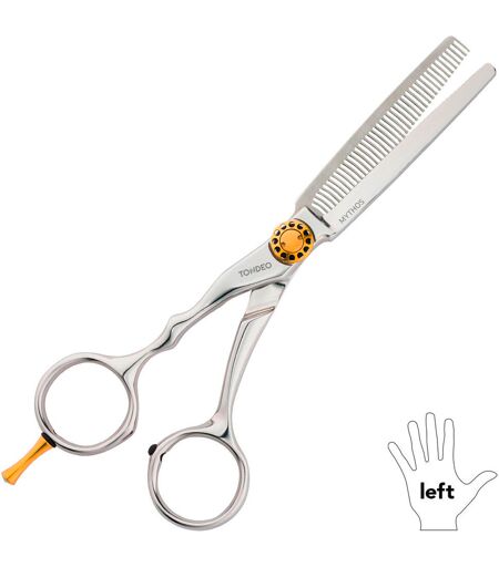 STERKE PRESTATIE MET LINKS Eindelijk kunnen ook linkshandigen zich onderdompelen in de wereld van maximale precisie en een boterzacht snijgevoel. MYTHOS Conblade Links met geïntegreerde Conblade snijkant, die zichtbaar anders geslepen, voelbaar extremer gevormd en daardoor merkbaar scherper is - ontwikkeld en handgemaakt door professionals voor professionals. De MYTHOS Wave modelleerschaar met concentrische tulpvormige tanden. STAAL Vanadiumstaal: Langdurige scherpte en duurzaamheid dankzij schaarlegering met verhoogd vanadiumgehalte. Hogere slijtvastheid van het staal door het sub-zero verhardingsproces. SNIJRAND / MES Perfecte snij- en slipeigenschappen dankzij de hoogste stabiliteit en maximale scherpte. Convex lemmet met geïntegreerde vlijmscherpe snijkant en kleinste snijkanthoek voor maximale randscherpte. CONBLADE met extreem holle slijping en extreem convex blad voor het hoogste snijgevoel. Contouren schaar: Met concentrische tulpvormige tanden voor dynamisch werk en zachte overgangen in langer haar. SCHROEFVERBINDING / TANDWIEL Fijnstelschroef: basisspanning instelbaar met ergonomische instelsleutel; individuele fijnafstelling via instelwiel. Fijn gepolijste speciale tandwielpunt voor boterzacht schakelen. OPPERVLAK Hoogwaardige, met de hand gepolijste, glanzende afwerking. SPECIAAL KENMERK Speciale gewichtsverdeling. ...