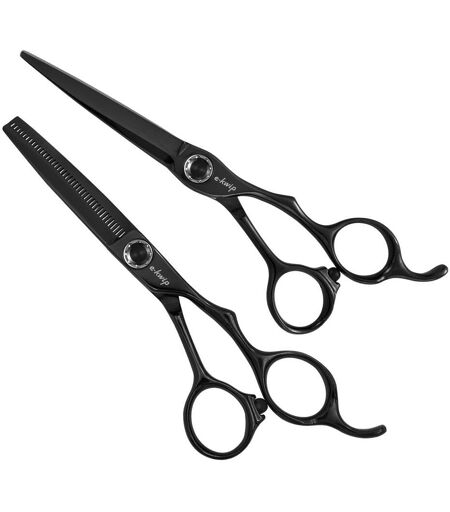Set bestaande uit 1 knipschaar + 1 modelleerschaar: perfecte ergonomische vormvaste vingerhaak in Japanse stijlZwaard - lemmet voor optimale voorspanning van de snijmessen en krachtige snedezwarte titanium coatingjapans staal - kwaliteitknipschaar: 5.5"modelleer schaar: 5,5" met 40 tandennieuwe zichtbare kogellager - schroefsysteem voor eenvoudigste bediening ...