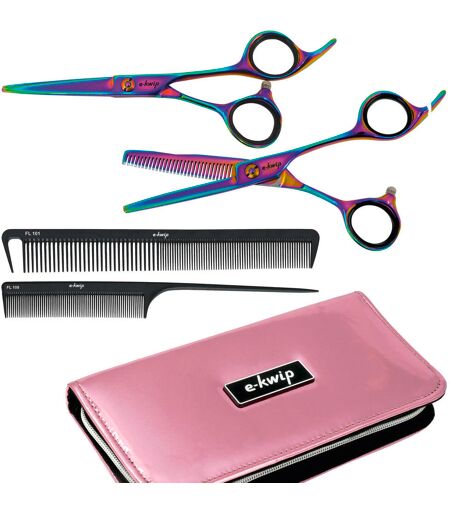 Deze set bestaat uit: Knipschaar Kleur 5.5"Modelleerschaar Kleur 5,5" (30 tanden) Ergonomische, gebogen handgreep voor ontspannen snijdenStevige vingerhaakJapan staalkwaliteit2 Flex Line siliconen kammenGereedschapstas roze ...