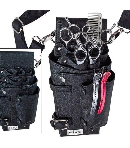 Gereedschapstas van generfd imitatieleer met riem. 2 grote zakken voor gereedschap5 zakken voor scharenKliksluiting aan de onderkant voor gemakkelijk verwijderen van haarafmetingen: 23 x 12,5 x 5 cmLevering zonder inhoud ...