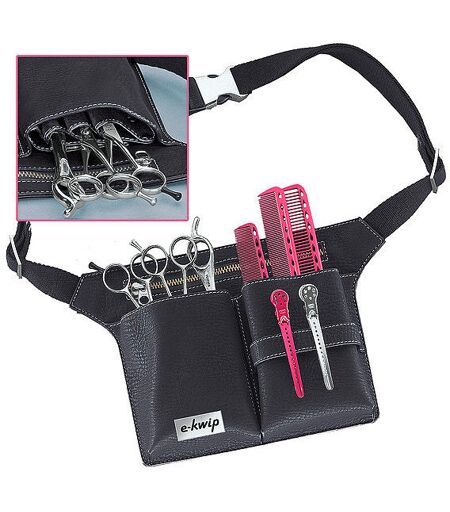Afmetingen: 22 cm x 19 cm x 3 cm. Zwart imitatieleer, met riem. 2 grote zakken voor gereedschap1 ritsvak4 kleine zakjes voor scharenLevering zonder inhoud ...