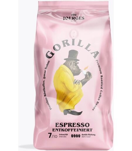d in een volautomaat, percolator of piston. De espresso zonder cafeïne van Gorilla wordt afgevuld in de vacuümzak van 1 kg en is klaar om thuis van te genieten. Met zijn eigen merk Gorilla heeft de grote branderij A. Joerges zich tot doel gesteld om voor elke smaak de ideale samenstelling te vinden. ...