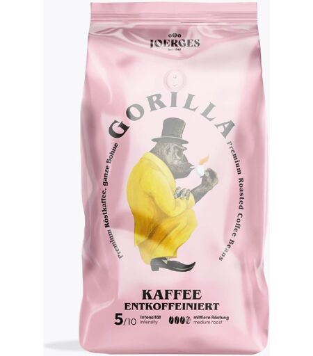 e machine, als filterkoffie of in een piston. De cafeïnevrije Gorilla koffie wordt in de vacuümzak van 1 kg gedaan en is klaar om thuis van te genieten. Met zijn eigen merk Gorilla heeft de grootschalige branderij A. Joerges zich tot doel gesteld om voor elke smaak de ideale samenstelling te vinden. ...