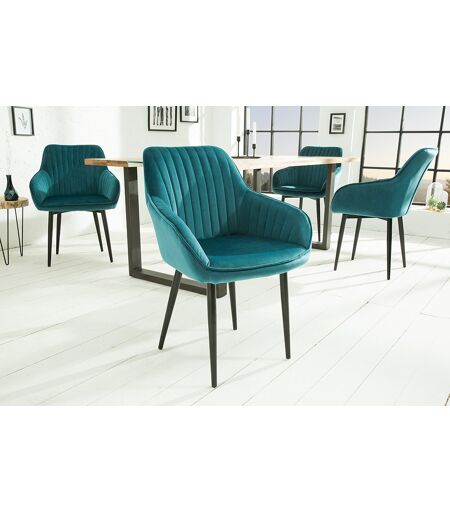 Eetkamerstoel met chique look en passend in verschillende interieurstijlen. Een prachtige stoel die een mooie plek verdient in jouw interieur. De zitting is bekleed met een zachte fluwelen stof en de rugleuning is heeft verticaal gestikte naden. De stoel heeft trendy zwarte poten en gecombineerd met de sierrits aan de achterkant van de rugleuning maakt van de eetkamerstoel een mooie eyecatcher aan je eettafel. Afmetingen bxdxh: 60 x 61 x 84 cm Overige... ...