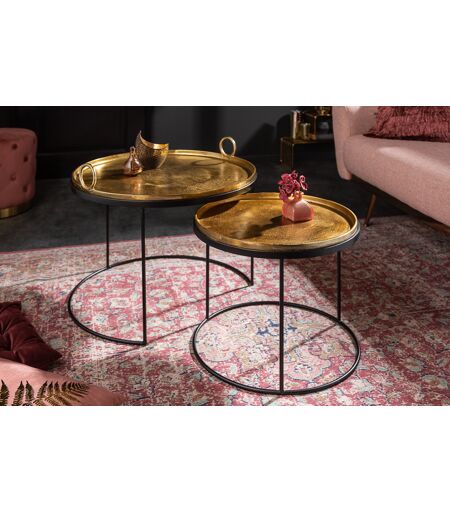 Stijlvolle salontafel set met goudkleurige tafelbladen gecombineerd met metalen zwarte frames. De tafeltjes kunnen in elkaar geschoven worden. Tafelbladen zijn afneembeer en tevens te gebruiken als bijvoorbeeld dienblad. Afmetingen:  Grote tafel (ØxH): 62 x 62 x 45 cm Medium tafel (ØxH) 46 x 46 x 39 cm Overige informatie: Binnenmaat kleine tafelblad 45 cm Binnenmaat grote tafelblad 60... ...