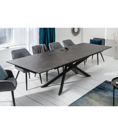 Moderne stijlvolle uitschuifbare eetkamertafel gecombineerd met design onderstel. Moderne stijlvolle uitschuifbare eetkamertafel gecombineerd met design onderstel. Deze eettafel heeft een groot tafelblad gemaakt van hoogwaardig Italiaans keramiek in donker marmerlook. Het keramiek is aangebracht op een stevig blad van veiligheidsglas. Het oppervlak van het tafelblad is iets opgeruwd om een échte marmer look en feel te bereiken. De imposante gekruiste tafelpoten in een robuuste industriële... ...