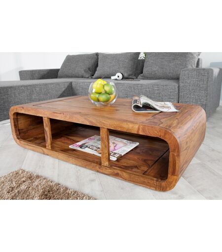 Bijzondere salontafel met ronde vormgeving en inclusief opbergruimte. Het betreft een natuurproduct, kleurafwijkingen en oneffenheden zijn mogelijk. Kleursamenstelling en vormen zijn nooit identiek. Afmetingen bxdxh 100 x 50 x 28 cm open vakken vanaf zijkant 28 x 45 x 20 cm Kleur: Tafelblad: bruin Materialen: sheesham hout Sheesham hout vindt zijn oorsprong in India en Vietnam. Het betreft een duurzame houtsoort en heeft een... ...