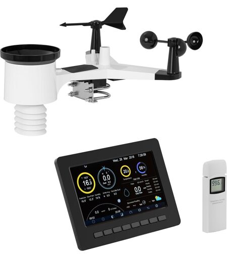 WiFi maakt het mogelijk! Het draadloze weerstation sluit je aan op je computer en je hebt toegang tot de weerservers van Ecowitt, WU, Weathercloud en WOW. Dit geeft u nog meer mogelijkheden om uw weergegevens in realtime te analyseren. U kunt de console ook via USB (kabel niet meegeleverd) op uw computer aansluiten of de verzamelde gegevens opslaan op een SD-kaart. Maar eerst verzamelt het wifi-weerstation tal van weergegevens, die ook een weersvoorspelling mogelijk maken. De buitensensor is draadloos verbonden met het station op een afstand van maximaal 100 m en verzamelt gegevens over temperatuur, vochtigheid, windsnelheid, windrichting, luchtdruk, UV-straling en helderheid. Alle gegevens worden duidelijk weergegeven op het 7" grote LCD-display met achtergrondverlichting, waar deze ook direct kan worden opgeroepen. Het buitenstation van het draadloze weerstation WiFi wordt bediend met zonnecellen, waarbij ook twee batterijen als back-up worden gebruikt. In de Set zit ook een binnensensor die je informatie geeft over het binnenklimaat. Dankzij de modernste meettechnologie bepaalt het wifi-weerstation uit de verzamelde weergegevens een trend voor het weer, die wordt weergegeven met een duidelijk pictogram. Temperatuurwaarden kunnen worden weergegeven in °C of °F en windsnelheid in mph, m/s, km/h, knopen, ft/m of Beaufort, afhankelijk van de voorkeur. Neerslaggegevens kunnen worden verzameld en geëvalueerd over korte en lange perioden. Voor sommige weergegevens kun je een maximum of minimum bepalen, op basis waarvan het professionele wifi weerstation waarschuwt voor extreme weersomstandigheden. De ontvangen gegevens worden regelmatig om de 16 s gesynchroniseerd met het wifi-weerstation. Daarnaast worden de helderheid en de UV-straling bepaald en weergegeven volgens internationale normen. Er zijn verschillende schalen beschikbaar voor de temperatuur, zoals de waargenomen of werkelijke temperatuur. Naast de talrijke meetgegevens biedt het weerstation ook verdere informatie zoals maanstanden of zonsopgang en zonsondergang. Voor een gemakkelijke bediening van het draadloze weerstation kan het aan de muur worden gemonteerd of op een standaard worden geplaatst. ...