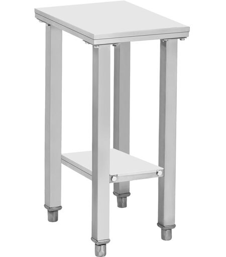 Het roestvrij stalen onderstel voor friteuses RCSF-15E van Royal Catering is een hoogwaardige metalen tafel, ontworpen voor professioneel gebruik in horecabedrijven, en biedt een verscheidenheid aan toepassingen. Het is het ideale keukenaccessoire voor hotels, bars, bistro's, fastfood-restaurants of cateringdiensten. Dankzij de grote platformruimte van 41 x 29 cm biedt het onderstel uit het horeca-assortiment voldoende plaats voor verschillende keuken- en werkapparatuur. De tafel is voornamelijk ontworpen als onderstel voor dubbele friteuses, maar kan ook dienen als een opbergplaats voor wafelijzers, vleesmolens of servies. Het roestvrij stalen onderstel is dus multifunctioneel. Als extra opslagruimte vindt u een andere plank in het onderste gedeelte, waarop u uw keukengerei kunt leggen en bij de hand kunt houden. Met zijn bijzonder hoge lastcapaciteit tot 150 kg, draagt het onderstel zelfs zware keukenapparatuur, zoals friteuses, en kan daarom met elk keukenaccessoire worden gebruikt. Met name in professionele keukens, waar vaak grote keukenmachines worden gebruikt, kan de tafel dus nuttige diensten verlenen. Omdat het roestvrij stalen onderstel voor friteuses voorzien is van in hoogte verstelbare poten, kan de hoogte van de tafel aan uw individuele behoeften worden aangepast. De aanpassing maakt het ook mogelijk om oneffenheden op de bodem te compenseren, zodat het platform veilig kan worden gebruikt in een optimale, horizontale positie. Het onderstel is gemaakt van hoogwaardig roestvrij staal en biedt daardoor een zeer hoge stabiliteit en lange levensduur. Daarnaast is roestvrij staal het ideale materiaal voor de professionele omgang met voeding, omdat het metaal een hoge weerstand tegen biologische en chemische reacties heeft. Het eenvoudige ontwerp van het onderstel garandeert een snelle montage en demontage van de tafel in slechts enkele stappen. De bijbehorende gebruiksaanwijzing is inbegrepen. Het onderstel is dus in erg korte tijd klaar en vormt direct een aanvulling op uw keuken als praktisch keukenmeubel. Vanwege het extreem stevig ontwerp biedt het roestvrij stalen onderstel voor friteuses een hoge mate van veiligheid tijdens het gebruik. Met name de massieve poten van de tafel zorgen voor de veilige stand van de apparatuur die erop wordt geplaatst, zelfs als deze bijzonder zwaar is. Het onderstel voor friteuses houdt met gemak stand! Het minimalistische ontwerp van het onderstel past uitstekend in elk modern keukeninterieur. En dankzij de hoogwaardige roestvrij stalen verwerking, is de tafel ook bijzonder eenvoudig schoon te maken. Het roestvrij stalen onderstel voor friteuses RCSF-15D van Royal Catering is daarom de perfecte aanvulling voor elke keuken! ...