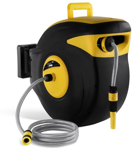 Met de automatische slanghaspel PRO-W 30 verlengt u de afstand tot wel 30 meter. Aan het huis of in de tuin, u hebt nu altijd genoeg speelruimte om water te geven. MSW biedt u hoogwaardige apparaten uit het tuinassortiment en tuinirrigatie aan. Gedraaide persluchtslangen en vervelend oprollen behoren tot het verleden, vanaf nu zorgt het automatische mechanisme van de persluchtslang voor orde. Dankzij de slimme constructie wordt de slang opgerold in lagen. Bij het afrollen heeft de tuinslang twee tot drie keer per meter een stopfunctie, zodat u altijd de gewenste slanglengte kunt afwikkelen. Voor het automatische oprollen hoeft u slechts één keer aan de slang te trekken, waarna deze volledig automatisch tot aan de klikstop wordt opgerold. Met een groter bereik en dus hogere mobiliteit, kunt u via de extra 30 meter water naar de gewenste locatie brengen. Bovendien is de slanghaspel tot 180° flexibel draaibaar. Het kraanwater moet een bedrijfsdruk van 8 bar hebben. De slanghouder van de persluchtluchtslang is zeer eenvoudig aan een plafond of muur te monteren. Het benodigde montage-toebehoor zijn inbegrepen. Bovendien draagt de trommel bij aan de veiligheid op het werk. In de gesloten kunststofbehuizing wordt de persluchtslang van 10 meter veilig opgeborgen en beschermd tegen slijtage. ...