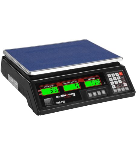 De SBS-PW-352B controleweger levert bijzonder nauwkeurige meetresultaten, heeft een maximaal weegvermogen van 35 kg en een nauwkeurigheid van 2 g. De weegschaal is daarom ideaal voor werkzaamheden in het magazijn, werkplaats, groothandel, voedingsindustrie of andere ruimtes waar het productgewicht wordt gecontroleerd. De weegschaal is al gekalibreerd, vereist geen extra aanpassingen en is direct klaar voor gebruik. In het assortiment van Steinberg vindt u hoogwaardige industriële benodigdheden en nauwkeurige weegschalen voor alle soorten taken. Tijd is kostbaar en u wilt natuurlijk snelle, nauwkeurige weegresultaten. De weegschaal geeft de resultaten direct weer, zelfs bij de nulstelling reageert het display onmiddellijk. De weegschaal heeft zes LCD-displays. Het bijzondere aan de weegschaal is dat deze zogenaamde klanten-displays op de achterkant heeft. Zo zien uw klanten altijd de juiste meetwaarden in een oogopslag. Het weegresultaat, de eenheidsprijs en de totale kosten kunnen op die manier worden getoond. Dankzij de achtergrondverlichting kant u met het display comfortabel werken, zelfs op donkere plaatsen. U kunt de verlichting aan- en uitschakelen. De elektronische weegschaal heeft verschillende praktische functies. Met de tarrafunctie bepaalt u het nettogewicht van een object zonder verpakkingsmateriaal en met de PCS-functie is het mogelijk om individuele objecten (25, 50, 75 of 100 stuks) te tellen. Wanneer de automatische nulpuntcorrectie is geactiveerd, geeft de weegschaal altijd een stabiel nulpunt aan, bijvoorbeeld wanneer de kamertemperatuur verandert. Om een lange levensduur te garanderen, is de controle weegschaal uitgerust met een geïntegreerde batterij, die een werking van maximaal 40 uur mogelijk maakt. Zelfs tijdens het laden kunt u gemakkelijk werken met de weegschaal. Wanneer de weegschaal niet wordt gebruikt op batterijvoeding, wordt de energiebesparende modus na 10 seconden ingeschakeld, waardoor de batterij wordt beschermd en energie wordt bespaard. Verder is een batterijwaarschuwing geïntegreerd. Wanneer het batterijniveau laag is, geeft het display een grafisch symbool weer dat u op de hoogte brengt van de noodzaak om op te laden. De weegschaal heeft nog een waarschuwing, de indicator voor overbelasting. Als de schaal wordt overschreden, wordt u op de display gewaarschuwd met een pieptoon en een symbool. Het toetsenbord wordt gekenmerkt door zijn water- en vetbestendigheid. Wanneer u objecten weegt, kunt u de toetsen 0 tot 9 gebruiken om de prijs per eenheid in te voeren, bijvoorbeeld €/kg waarna de weegschaal de totale prijs berekent. Dankzij de robuuste rubberen poten heeft de weegschaal altijd een veilige en slipbestendige stand en beschermen de poten uw werkoppervlak tegen krassen. De weegschaal heeft een zeer groot afneembaar roestvrijstalen weegoppervlak met de afmetingen van 33 x 24 cm. Bij het ontwerpen van de weegschaal SBS-PW-352B werd veel belang gehecht aan een compact ontwerp. De compacte totale afmetingen... ...