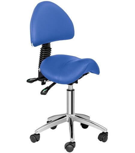 Deze comfortabele zadelstoel PHYSA BERLIN BLUE heeft een zitting in de vorm die de naam al doet vermoeden. Uitgerust met draaibare soepel lopende wielen en verschillende instelmogelijkheden, past deze zadelstoel in elke schoonheids- of kapsalon, vooral wanneer de hoogte- en hellinginstellingen, comfort en de stabiliteit tegelijkertijd gevraagd zijn. De zadelstoel biedt u zelfs in kleine ruimtes veel bewegingsvrijheid, is van hoge kwaliteit en kan tot wel 150 kilogram dragen. Wat deze zadelstoel onmisbaar maakt: brede inzetbaarheid, bijvoorbeeld in tattoo-studio's, in spa- of wellnessfaciliteiten, thuis en op kantoor. Als u uw klanten maximaal comfort wilt bieden, bent u met deze zadelstoel perfect uitgerust: de rugleuning kan tussen 90 en 120 graden worden gekanteld. Een hoek van 120 graden is het gezondst voor de wervelkolom, maar dit hangt van de gebruiker af. De rugleuning kan nauwkeurig worden aangepast aan individuele behoeften dankzij de gemakkelijk te gebruiken hendel aan de achterzijde. De gestoffeerde stoel is bekleed met kunstleder en gevuld met 5 cm dik schuimstof - wat extra comfort voor uw klanten biedt. De stoel is uitgerust met een onderstel met vijf soepel lopende, 360 ° draaibare wielen. Deze maken het duwen of naar zich toe trekken van de stoel wezenlijk makkelijker, of het nu in commerciële of woonruimtes is. Tegelijkertijd geeft de basis de stoel stabiliteit. Niet alleen de lichtgewicht wielen zijn draaibaar, de hele zadelstoel kan 360 ° worden gedraaid. Dit is vooral handig in alle banen waar mobiliteit nodig is. De zadelstoel kan bovendien gemakkelijk en snel in hoogte worden aangepast tussen 55 en 69 cm. Om de hoogte van de stoel te verstellen, volstaat het om de onder de stoel aangebrachte hendel in de betreffende richting te duwen. De stoel beweegt dan gemakkelijk omhoog of omlaag dankzij de efficiënte pomp. Het maximale draagvermogen van 150 kilogram maakt de stoel onmisbaar op het werk of bij u thuis. De kunstlederen bekleding is gemakkelijk schoon te maken en te onderhouden omdat deze vloeistof- en stofafstotend is. Hoogwaardige materialen zorgen voor een robuuste constructie. De mix van verchroomd ijzer en de elegante blauwe bekleding zorgen tegelijkertijd voor een zeer stijlvolle en aantrekkelijke look. ...
