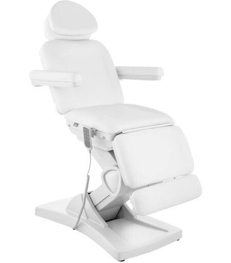 De volautomatische behandelstoel BOLZANO WHITE met afstandsbediening biedt uw klanten het hoogste comfort bij het liggen of zitten. Tegelijkertijd kunt u cosmetische behandelingen comfortabel en rugvriendelijk uitvoeren. Dankzij de veelzijdige instelmogelijkheden is de cosmeticastoel ook geschikt voor gebruik in styling-, tatoeage- en piercingstudio's, in spa- en wellnessfaciliteiten en als massagetafel. Dankzij de vier krachtige motoren kunt u de ligstoel eenvoudig in hoogte verstellen binnen een bereik van 65 tot 87,5 cm of de rugleuning, voetsteun en zithoek optimaal aanpassen aan de wensen van uw klanten. De hoofdsteun, die tot 14 cm uitschuifbaar is, is volledig afneembaar. Het heeft een afsluitbare gezichtsuitsparing, waardoor u de cosmetische stoel eenvoudig kunt omvormen tot een massagetafel. Het extra dikke kussen en de verstelbare armleuningen garanderen te allen tijde maximale ontspanning voor uw gasten. Een praktisch handdoekenrek completeert de functies van het schoonheidsbed. De zachte vulling in combinatie met de eersteklas olie- en waterafstotende kunstleren bekleding zorgt voor een hoog comfortniveau en perfecte hygiëne. Dankzij de slimme constructie, het grote onderstel van gepoedercoat ijzer en de hoogwaardige materialen kan de cosmeticatafel een gewicht tot 150 kg dragen. Als het om duurzaamheid gaat, laat dit schoonheidsbed niets te wensen over en maakt tegelijkertijd indruk met zijn klassieke uitstraling in elegant wit. ...