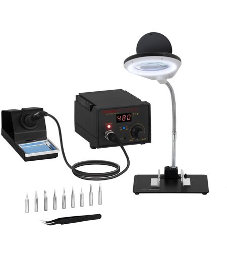 Het digitale soldeerstation S-LS-12 van Stamos Soldering is het ideale apparaat voor soldeer- en reparatiewerkzaamheden aan elektrische apparaten, printplaten, vertinnen, metalen onderdelen en nog veel meer. Het digitale soldeerstation overtuigt door de combinatie van eenvoudige bediening en het beste soldeercomfort. Dit zorgt voor nauwkeurig solderen en desolderen bij privégebruik met professionele normen. Het krachtige soldeerstation is uitgerust met 60 watt en een soldeerbouttemperatuurbereik van 200 - 480 °C, waardoor de soldeerbout snel opwarmt. Het geïntegreerde verwarmingselement in de soldeerbout zorgt voor een optimale warmteoverdracht tijdens het werk. Dit garandeert solide en duurzame soldeerverbindingen en efficiënt werken. Het digitale soldeerstation is voorzien van specifieke ijzersteunen. Zowel tijdens als na het werk kan de soldeerbout veilig op de aparte plank met geïntegreerde droge spons worden geplaatst. De droge spons wordt gebruikt om de gevoelige soldeerpunt te reinigen en bevordert de levensduur van het materiaal. De soldeerbout kan net zo eenvoudig worden verwisseld via de steekverbinding met het basisstation. De basiseenheid, een speciale voedingseenheid, is snel en gemakkelijk te gebruiken. De temperatuur van de soldeerbout kan hier precies worden ingesteld en op het LED-display worden gecontroleerd. Naast deze gebruiksvriendelijke bedieningsopties kan de unit op het digitale display worden geschakeld tussen graden Celsius en Fahrenheit. Het S-LS-12 soldeerstation wordt als set met uitgebreide accessoires geleverd. Dit omvat een groot aantal verschillende soldeerpunten die nauwkeurig werken op verschillende gebieden mogelijk maken. De loeplamp verbetert ook de soldeerresultaten voor bijzonder fijne en kleinschalige projecten. Bovendien maakt het soldeerpincet het dagelijkse werk gemakkelijker en verbetert het de soldeertechniek. Het elektrisch gereedschap is uitgerust met een ESD-functie en wordt geleverd met een veiligheidsstekker. Deze kabel is essentieel om het apparaat te aarden en dus goed te laten functioneren. De ESD-functie beschermt het apparaat tegen elektrostatische ontladingen en zorgt zo voor een absoluut veilig gebruik. De basiseenheid is met zijn compacte ontwerp ook geschikt voor gebruik op kleine werkoppervlakken. Dankzij de hoogwaardige afwerking kan het station ook onderweg worden gebruikt. ...