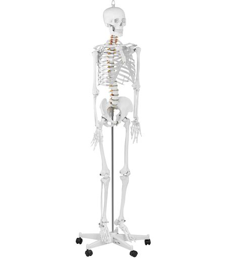 Het PHY-SK-1 skeletmodel van Physa is een levensgrote (176 cm) replica van een menselijk skelet op schaal 1:1. Het toont alle delen van het skelet tot in het kleinste detail. Deze omvatten met name schouders, handen, benen, schedels, ribben, wervelkolom, bekken en overtuigend weergegeven spinale vaten. Het skelet bestaat uit kunststof, waarvan de natuurlijk ogende oppervlaktestructuur en kleur nauwelijks van het "echte" skelet te onderscheiden is. Dit maakt het medische model ideaal voor onderwijs- en demonstratiedoeleinden op universiteiten, in klinieken en scholen als het gaat om de menselijke anatomie. En het hoort thuis in elke dokterspraktijk om aan patiënten hun klachten in het botapparaat te kunnen uitleggen. Ook in de particuliere sector is het vaak een spectaculaire attractie. Het medische model wordt geleverd met een stofkap en een grote kleurenposter waarop alle afzonderlijke delen van het menselijk botstelsel met naam en visueel zijn vermeld. Het skeletleermodel maakt ook indruk door de uitgekiende constructie van belangrijke lichaamsdelen. Dankzij roestvrijstalen veren kan de onderkaak worden bewogen om te demonstreren hoe het menselijke kauwapparaat werkt. Daarnaast zijn er vervangende tanden beschikbaar om het tandsysteem te illustreren. De schedel kan ook gemakkelijk en indrukwekkend worden geopend om waardevolle inzichten in de innerlijke werking te geven. Ook de ledematen en de belangrijkste gewrichten zoals ellebogen, handen en knieën kunnen worden bewogen, zodat de functies van het bewegingsapparaat realistisch kunnen worden gevisualiseerd. Over het algemeen is dit skeletmodel ook uitstekend als leerhulpmiddel dankzij de vele gekleurde delen. De kleuren ondersteunen visueel het begrip van het menselijk skelet en bewegingsapparaat en maken het gemakkelijker om de oorzaken van breuken, verstuikingen en botsplinters te analyseren. De hoogwaardige schroefverbindingen van roestvrij staal zorgen voor een stabiele opstelling van alle skeletdelen, zorgen voor stabiliteit en garanderen zo een lange levensduur van het gehele skelet. Indien nodig kunnen de schroefverbindingen eenvoudig weer worden losgemaakt. De steunstang waarmee het skelet op de basis wordt gemonteerd, is ook van roestvrij staal. Dankzij het RVS blijven deze onderdelen tientallen jaren glanzend, roesten niet en zijn makkelijk schoon te maken. Dankzij het doordachte schroefsysteem kan de montage van het skelet, de steunstang en de basis in slechts enkele minuten worden voltooid. De stevige basis heeft vijf lichtlopende zwenkwielen die 360° kunnen worden gedraaid, waarmee het trainingsskelet gemakkelijk over het terrein kan worden geduwd of getrokken zonder de stabiliteit van de skeletconstructie aan te tasten. Het skelet heeft ook een oogje aan de schedel. Hij kan bijvoorbeeld aan een haak aan de muur of het plafond worden gehangen om hem variabel te gebruiken of vanuit verschillende perspectieven te bekijken. ...