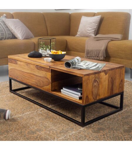Functionele salontafel van sheesham hout gecombineerd met metalen frame. Bijzondere salontafel met tafelblad dat omhoog gezet kan worden. Tevens biedt deze tafel hierdoor opbergruimte onder het tafelblad. Deze salontafel is verkrijgbaar in de circa afmeting (breedte x diepte x hoogte): 110 x 50 x 40 cm Overige afmetingen BxDxH: open vak 35,5 x 50 x 19 cm opbergvak onder tafelblad 54,5 x 47 x 9 cm dikte tafelblad 1,5 cm dikte metalen frames 2... ...