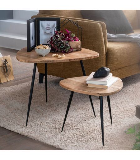 Een moderne bijzettafel set met driehoekvormige tafelbladen van acaciahout gecombineerd met onderstellen van metaal. De tafels zijn geschikt om over elkaar heen geschoven te worden.Deze bijzettafel set acacia is leverbaar in de afmeting Ø x H:60 x 60 x 51 cm42,5 x 42,5 x 37 cmKleurcombinatie: bruin met natuurlijke houtpatronen / zwartMaterialen:acaciahout / metaal ...