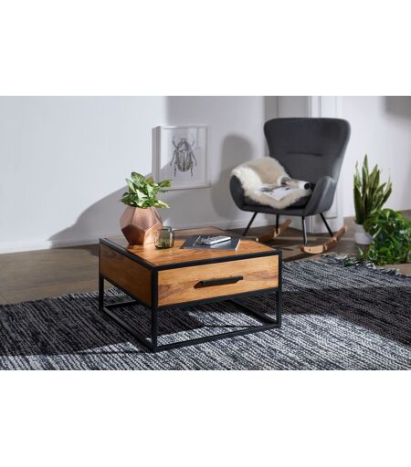 Moderne salontafel van massief hout gecombineerd met zwart metalen frames. Functionele salontafel met lade. Deze tafel is verkrijgbaar in de afmeting (lengte x breedte x hoogte): 65 x 65 x 38 cm Overige afmetingen: Zie bijgesloten beeld met afmetingen Kleurcombinatie: Tafelblad: bruin Poten: zwart Materialen: Tafelblad: massief sheesham hout gelakt Frames: metaal poedercoating ...