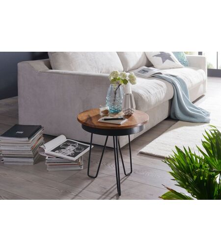 Bijzettafel met houten tafelblad gecombineerd met metalen rand en poten. Afmeting: Ø 43 x H 45 cm Kleurcombinatie: bruin / zwart Materiaal: sheesham hout / metaal ...