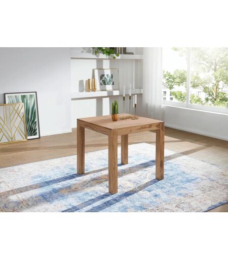 Moderne functionele eetkamertafel / keukentafel van acaciahout. Afmeting BxDxH: 80 x 80 x 76 cm Overige afmetingen: Tafelbladdikte 1,5 cm Hoogte van zijpanelen 6,5 cm Afmeting tot onderzijde tafelrand 68 cm Dikte poten 7,5 x 7,5 cm Kleur: lichtbruin met houtpatronen houtsoort: sheesham hout ...