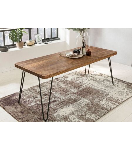 Moderne eettafel sheesham met 50 mm sterk houten tafelblad en gecombineerd met metalen poten. Deze eettafel sheesham is verkrijgbaar in de afmeting: 200 x 80 x 76 cm Het betreft een natuurproduct. Het tafelblad heeft diverse kleurschakeringen en een vlammende uitstraling. Kleurcombinatie: Tafelblad: bruin Onderstel: zwart Materiaal: Tafelblad: sheesham hout gelakt Onderstel: metaal poedercoat ...