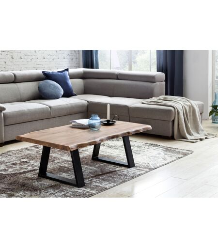 Moderne strak vormgegeven salontafel met échte boomstam zijkanten. De tafel is gecombineerd met zwart metalen onderstel in trapezevorm.Afmeting BxDxH:115 x 60 x 40 cmDikte tafelblad: ca 4 cmKleurcombinatie:Tafelblad: bruinOnderstel: zwartMaterialen: Tafelblad: acacia hout onbehandeldOnderstel: metaal poedercoating Het betreft een natuurproduct, kleurafwijkingen, noesten en oneffenheden zijn mogelijk. Kleursamenstelling en vormen zijn nooit identiek. ...