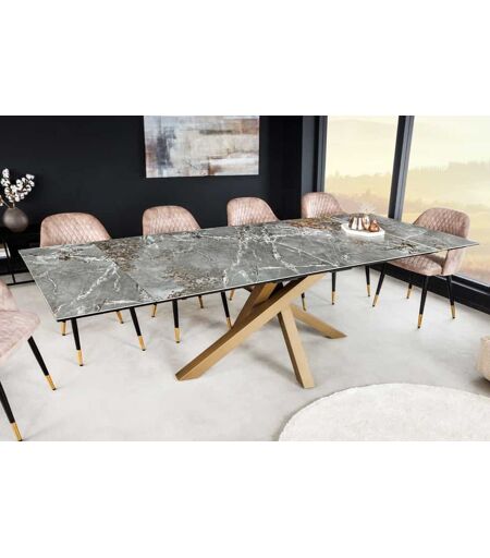 Moderne uitschuifbare design eetkamertafel met tafelblad van krasbestendig keramiek. Gecombineerd met een prachtig zwart metalen design onderstel. Deze luxe eetkamertafel is leverbaar in de afmeting bxdxh: 180-220-260 x 90 x 76 cmKleurcombinatie:Tafelblad taupe kleurDesign onderstel goudMateriaalcombinatie:Tafelblad glas keramiek 13mm dikFrame van metaal poedercoating ...