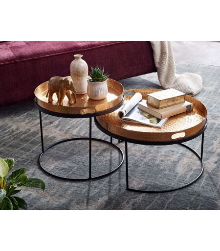 Bijzondere salontafel set met goudkleurige dienbladen gecombineerd met metalen zwarte frames. De tafeltjes kunnen in elkaar geschoven worden. Afmetingen: Grote tafel (ØxH): 56 x 56 x 33 cm Medium tafel (ØxH) 46 x 46 x 41 cm Materiaaldikte onderstel: 1,5 cm Tafeltjes maximaal te belasten met 20 kg Kleurcombinatie: Tafelbladen: goudkleurig Frame: zwart Materiaal: Tafelbladen van aluminium gelakt Frames van metaal ...