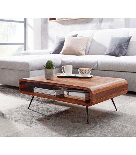 Sfeervolle salontafel in retro styling met ronde vormgeving gecombineerd met zwarte metalen poten. Sheesham hout vindt zijn oorsprong in India en Vietnam. Het betreft een duurzame houtsoort en heeft een kenmerkende 'vlammende' uitstraling. Deze salontafel is verkrijgbaar in de afmeting (lengte x breedte x hoogte): 90 x 55 x 30 cm Afmeting opbergvak bxdxh: 85,5 x 55 x 10 cm Kleur: donkerbruin Materiaal: massief sheesham... ...