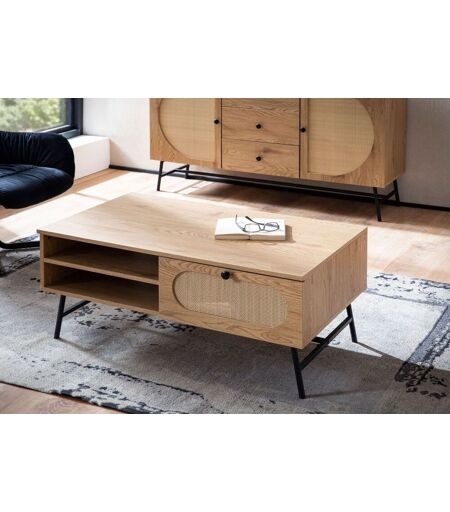 Moderne rechthoekige salontafel met één lade die voorzien is van rotan vlechtwerk. Deze salontafel is verkrijgbaar in de afmeting LxBxH:100 x 60 x 45 cmKleurcombinatie: Tafelombouw en fronten eiken kleurHandgreep en pootjes zwartMaterialen:Tafelombouw van meubelplaat voorzien van eiken decor afwerkingLade voorzien rotan vlechtwerkHandgreep en pootjes van metaal ...
