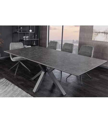 Moderne rechthoekige uitschuifbare eettafel met tafelblad van keramiek in de kleur grafietgrijs. De tafel is voorzien van zwart metalen onderstel. Deze stijlvolle eettafel wordt het middelpunt van uw eethoek! Het moderne tafelblad van hoogwaardig Italiaans keramiek in grafietgrijs maakt niet alleen indruk met zijn exclusieve design, maar ook met zijn buitengewone weerstand. Het zacht gestructureerde oppervlak geeft het een bijzonder gevoel en zet elegante accenten.Deze eettafel heeft de ca.... ...