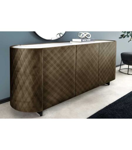 Modern design dressoir met retro uitstraling! Het dressoir heeft een bijzonder mooie 3D afwerking op zowel de romp als de deuren. Het bovenblad is van keramiek met marmer effect en de poten zijn van zwart metaal. Achter de twee deuren is er een extra lade beschikbaar voor nog meer opbergruimte. Het dressoir is een échte eyecatcher in de woonomgeving!De fronten van dit dressoir maken indruk met een karaktervolle 3D-diamantstructuur in een geborstelde bronskleurige afwerking. Dit verfijnde... ...