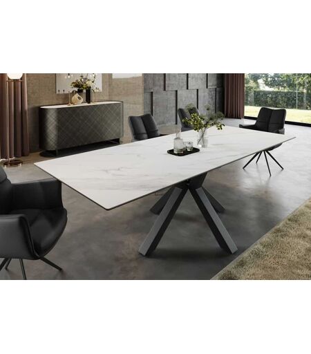 Deze stijlvolle uitschuifbare eettafel wordt het middelpunt van uw eethoek! Het edele tafelblad van hoogwaardig Italiaans keramiek met marmeren decor maakt niet alleen indruk met zijn exclusieve design, maar ook met zijn buitengewone weerstand. Het zacht gestructureerde oppervlak geeft het een bijzonder gevoel en zet elegante accenten. Het metalen zwarte matrix frame zorgt voor stabiliteit en vormt een spannend contrast met het fijne uiterlijk van het keramische blad.Dankzij de intelligente... ...