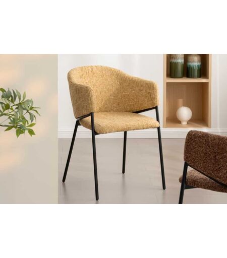 Dineer in stijl met deze moderne gele eetkamerstoel! Deze elegante ingetogen eetkamerstoel brengt strakke lijnen in uw huis met de gele chenille stoffen bekleding. De zachte bekleding nodigt uit tot gezellig tafelen en zorgt voor een comfortabele zitervaring. Het metalen frame in matzwart vormt een modern contrast en onderstreept het elegante design. De gebogen rugleuning met geïntegreerde armleuningen combineert een stijlvolle uitstraling met een hoog zitcomfort.Combineer de stoel evt. met de... ...