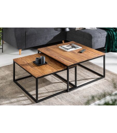 Moderne trendy salontafel set voorzien van massief sheesham houten tafelbladen en gecombineerd met zwart poedercoat frames. De tafel set wordt compleet gemonteerd geleverd.Deze salontafel set sheesham is verkrijgbaar in de afmetingen breedte x diepte x hoogte:tafel groot: 65 x 65 x 40tafel klein: 55 x 55 x 35 cmMaterialen:Tafelbladen massief sheesham hout 15mm Frames van metaal poedercoating 2 x 2 cm ...