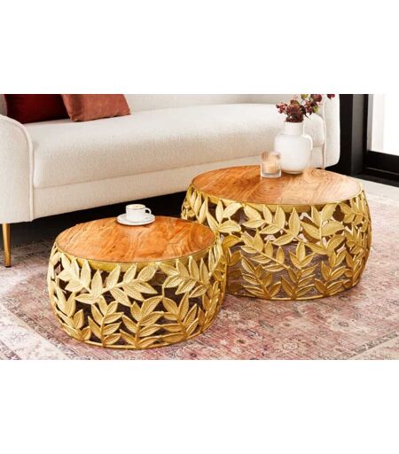 Exclusieve 2-delige salontafel set – massiefhout ontmoet metaal! Ervaar pure elegantie en tijdloze schoonheid met deze salontafels in een set van 2 die uw woonkamer omtoveren tot een stijlvolle ambiance. Deze unieke tafels combineren massief houten tafelbladen met sierlijke tafelonderstellen in een bladgoud design van hoogwaardig metaal. Ervaar hoogwaardig design in je woonkamer met onze ronde salontafels! Elegant design en hoogwaardige materialen! De massief houten tafelbladen... ...