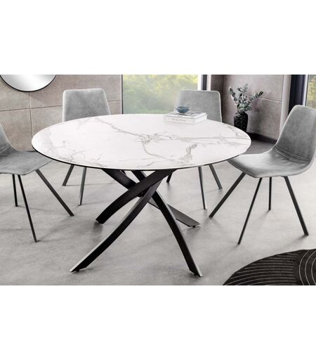 Ontdek moderne luxe – met deze ronde eettafel! Klassieke keramische tafel voor speciale momenten! Deze ronde tafel keramiek is leverbaar in de afmeting ØxH: 120 x 75 cm Overige afmetingen: Dikte tafelblad: 11mm Kleurcombinatie: Tafelblad wit met accenten Design poten zwart Materialen: Tafelblad van veiligheidsglas 0,8mm en keramiek toplaag 03,mm Design poten van metaal poedercoating ...