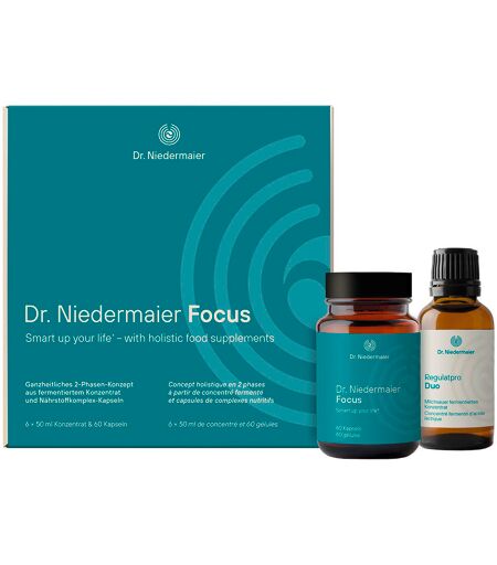 Holistisch 2-fasenconcept bestaande uit gefermenteerd concentraat (Regulatpro Duo) en nutriëntencomplexcapsules. De oplossing voor iedereen die zijn mentale fitheid, prestaties en concentratie op een natuurlijke manier wil ondersteunen¹. Zink en jodium dragen bij tot een normale cognitieve functie. Magnesium en vitamine B12 dragen bij tot een normaal energiemetabolisme, een normale werking van het zenuwstelsel en een normale mentale functie. Deze set bevat: 6 x Regulatpro Duo, 50 ml1 x Focus, 60 capsules Toepassing: Regulatpro Duo: Neem 's ochtends 10 ml Regulatpro Duo verdund in water. Dr Niedermaier Focus capsules: Neem 's ochtends 2 capsules Dr Niedermaier Focus met Regulatpro Duo verdund in water. De aanbevolen dagelijkse hoeveelheid niet overschrijden. Niet gebruiken ter vervanging van een evenwichtige en gevarieerde voeding en een gezonde levensstijl, die belangrijk zijn voor een goede gezondheid. Buiten het bereik van kleine kinderen bewaren. Niet bewaren boven 25 °C. Regulatpro Duo schudden voor gebruik. Na opening koelen. Het gebruik van verse ingrediënten kan variaties in geur, kleur, smaak en troebelheid veroorzaken. Geen kleurstoffen of bewaarmiddelen toegevoegd. Suiker- en glutenvrij. ...