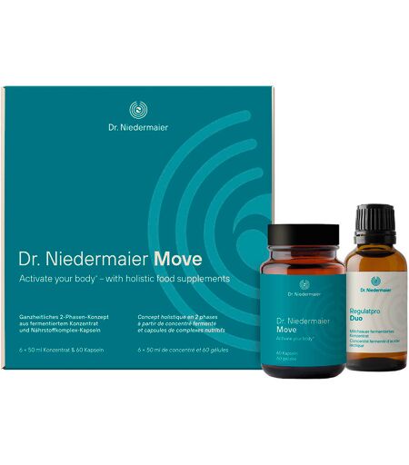 Holistisch 2-fasenconcept bestaande uit gefermenteerd concentraat (Regulatpro Duo) en nutriëntencomplexcapsules. De oplossing voor iedereen die zijn sportprestaties, uithoudingsvermogen en prestaties op een natuurlijke manier wil ondersteunen om duurzaam succes te behalen. ¹ Thiamine, riboflavine, niacine, vitamine B6 en vitamine B12 dragen bij tot een normaal energiemetabolisme. IJzer draagt bij aan een normaal energiemetabolisme en normaal zuurstoftransport in het lichaam. Magnesium draagt bij tot de elektrolytenbalans, een normale spierfunctie, een normale eiwitsynthese en de instandhouding van normale botten. Deze set bevat: 6 x Regulatpro, 50 ml1 x Move, 60 capsules Toepassing: Regulatpro Duo: Neem 's ochtends 10 ml Regulatpro Duo verdund in water. Dr Niedermaier Move capsules: Neem 's ochtends 2 capsules Dr Niedermaier Focus met Regulatpro Duo verdund in water. Bevat cafeïne (25 mg per dagelijkse dosis). Niet aanbevolen voor kinderen en zwangere vrouwen. De aanbevolen dagelijkse hoeveelheid niet overschrijden. Niet gebruiken ter vervanging van een evenwichtige en gevarieerde voeding en een gezonde levensstijl, die belangrijk zijn voor een goede gezondheid. Buiten het bereik van kleine kinderen bewaren. Niet bewaren boven 25 °C. Regulatpro Duo schudden voor gebruik. Na opening koelen. Het gebruik van verse ingrediënten kan variaties in geur, kleur, smaak en troebelheid veroorzaken. Geen kleurstoffen of bewaarmiddelen toegevoegd. Suiker- en glutenvrij. ...