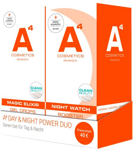 De A4 Cosmetics Dag & Nacht Serums Set bevat: 1 x A4 Magic Elixir, 20 ml1 x A4 Nachtwacht Booster, 20 ml A4 Magic Elixir: A4 Magic Elixir is een zeer effectieve anti-aging gezichtsgel van Argan Research 2.0 voor diepgaande verjonging van je huid. Het is geen magie, maar het voelt wel zo. Het elixer bevat 100% plantaardig arganstamcelextract, dat het celmetabolisme in het bindweefsel helpt activeren, de huidcellen beschermt en zo huidveroudering vertraagt. De huid ziet er langer jeugdig fris en stevig uit, de vermindering van rimpels en een grotere huiddichtheid worden ondersteund. Toepassing: U dient de A4 Magic Elixir gezichtsgel 1 tot 2 keer per dag na de reiniging aan te brengen op uw gezicht, hals en decolleté. Daarna kunt u uw gebruikelijke huidverzorgingsproducten aanbrengen. A4 Magic Elixir is ideaal voor een intensieve kuur van 30 dagen. Deze gezichtsgel is de juiste hulp voor elk huidtype. Hoofdingrediënten: Geef de natuur de kans om al haar magie te laten werken. Hiervoor bevat de waardevolle Magic Elixir gezichtsgel de volgende werkstoffen: De sterk geconcentreerde verzorging met natuurlijk ROSE WATER bevat de eerste cosmetische plantaardige werkstof die helpt de vitaliteit van de huidcellen te activeren en hun cellulaire eigenschappen te behouden.Het effect wordt versterkt door speciale hooggedoseerde boodschapperpeptiden die de activering van de huideigen herstelprocessen kunnen ondersteunen.PLANTOLIGOSACCHARIDEN helpen het huidreliëf te verbeteren, rimpels glad te strijken en geven de huid zo een nieuwe teint en elasticiteit.Een HUID-IDENTISCH LIPID-CONCENTRAAT voorziet de huid van meer vocht en verhoogt de bescherming van de huid.Een werkstoffencomplex van hyaluronzuur met lange en korte keten bevordert de hydratatie van de huid en helpt irritatie door omgevingsinvloeden te verminderen.Panthenol (provitamine B5) werkt ontstekingsremmend en regenererend. A4 Night Watch Booster: A4 NIGHT WATCH BOOSTER is een zeer effectief en snelwerkend actief systeem voor de nacht: de nieuwe, intelligente anti-aging booster werkt met een innovatief Probiotic Technology Complex en 100% plantaardig argan stamcelextract om de gladmakende actieve ingrediënten precies daar te brengen waar de huid ze nodig heeft - in de cellen. Het bijzondere aan deze combinatie van werkstoffen: de natuurlijke herstelmechanismen worden gestimuleerd en de beschermende functie van de huid wordt versterkt. Toepassing: Voor een intensieve verzorging 's avonds na de reiniging aanbrengen op gezicht, hals en decolleté en zachtjes inmasseren. Voor een optimaal resultaat daarna A4 NIGHT WATCH CREME aanbrengen. Hoofdingrediënten: De hoofdingrediënten van de perfect uitgebalanceerde anti-aging formule zijn van plantaardige oorsprong voor een sensationeel snel werkend serum: Probiotic Technology Complex ondersteunt de productie van essentiële eiwitten en enzymen die uw huid vernieuwen, revitaliseren en weer laten stralen. De intensief gehydrateerde verzorgingsbooster gaat niet... ...