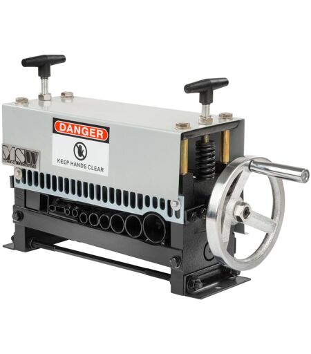 Met de handmatige kabelstripper WIRESTRIPPER-005 van MSW kun je kabels, draden en snoeren snel en nauwkeurig ontmantelen. Deze machine is geschikt voor koper-, aluminium- en platte kabels met een maximale dikte van 38 mm. De compacte, robuuste kabelpeller is mobiel en ontworpen voor gebruik in de industrie. Het apparaat is gemaakt van massief staalplaat en wordt handmatig bediend via een slinger. Een speciaal mechanisme brengt de interne snijrol in beweging en start het snijproces. Via 11 ingangen kan een groot aantal soorten kabels worden ontmanteld. Hiervan zijn acht sleuven bedoeld voor ronde kabels en drie voor platte kabels met een buitendiameter van 1,5 tot 38 mm. Via een roller wordt de kabel langs de roterende messen geleid en zo worden kabel en isolatie van elkaar gescheiden. Dankzij de uitstekende snede kan de kabelisolatie vervolgens makkelijk worden verwijderd. ...
