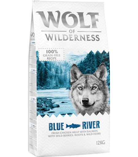 12kg "Blue River" met Zalm Wolf of Wilderness Hondenvoer