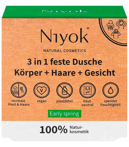3 in 1 solid shower body + hair + face - Vroege lente 100% plasticvrij, 100% alles-in-één: De stevige 3-in-1 douche van Niyok is geschikt voor het hele lichaam en zorgt tegelijkertijd voor veel vocht dankzij de formulering. In overeenstemming met zijn naam wordt de Vroege Lente gekenmerkt door groene lentetinten. Met een pH-waarde van 5,5 is het stuk huidneutraal, schuimt het rijkelijk en breekt het niet na gebruik omdat het niet is geperst. Toepassing: Houd de solide 3 in 1 douche kort onder het water en masseer direct op de natte huid, gezicht en haar. U kunt ook met water in uw handen schuimen tot zich voldoende schuim heeft gevormd. Vervolgens laten inwerken en volledig afspoelen. Niyok staat voor veganistische natuurlijke cosmetica in minimalistische stijl. Gemaakt in Duitsland. 100% plastic-vrij. Gecertificeerde natuurlijke cosmetica. ...