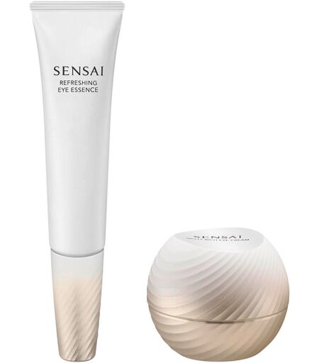 De eerste oogverzorging met de bijzondere claim om de ogen niet alleen te verzorgen, maar vooral te verfraaien. Het vernieuwende concept is gebaseerd op zowel verkoelende als verwarmende effecten, die op contrasterende maar synergetische wijze werken om de huid rond de ogen te versterken. s Ochtends verlicht de verwarmende, subtiel glinsterende, rijke crème de ogen. s Avonds zorgt de verkoelende essence, die vóór de crème wordt aangebracht met een verfrissende bolapplicator, voor helderheid en definitie. Een oogverzorgingsritueel met Refreshing Eye Essence en Melty Rich Eye Cream. Het effect van de verkoelende en verwarmende textuur wordt geoptimaliseerd door een extra massage om de oogcontour frisheid te geven en lijntjes en rimpels te verminderen. Dag na dag ziet de oogzone er steviger en jeugdiger uit en straalt de huid van binnenuit. Met de Total Eye Treatment komt de schoonheid van de oogcontour in een nieuw licht te staan. Uit de lijn van EXPERT producten. Individuele oplossingen voor een ZILLE HUID. De Totale Oogbehandeling bevat: 1 x Verfrissende Oog Essentie, 20 ml1 x Smeltend Rijke Oogcrème, 15 ml SENSAI VERFRISSENDE OOG ESSENCE Een zijdezachte essence die wordt aangebracht met een nikkelvrije roestvrijstalen bolapplicator die zachtjes over de huid glijdt om de oogcontour, het voorhoofd en de slapen te verkoelen. Total Eye Complex hydrateert en verfrist de huid. Dankzij de zichtbare gladstrijking van lijntjes en rimpels zien de ogen er helderder en duidelijker uit. Verkrijgbaar als navulling. s Avonds aanbrengen vóór de Melty Rich Eye Cream volgens de SENSAI-massagemethode. SENSAI SMELTENDE RIJKE OOGCRÈME Een rijke crème die de oogzone verwarmt met een extra massage. Met Total Eye Complex en Hydro Optimiser Complex, vermindert deze crème wallen, donkere kringen en rimpels en herstelt de stevigheid van de huid. De delicate parelpigmenten geven de ogen een extra glans. Verkrijgbaar als navulling. Alleen 's morgens en 's avonds aanbrengen na Refreshing Eye Essence met behulp van SENSAI's massage methode. Ingrediënten: KOISHIMARU ZIJDE ROYAL. Dit exclusieve anti-verouderingscomplex stimuleert de aanmaak van hyaluron in de huid. Dit unieke ingrediënt optimaliseert de conditie van de huid door haar intens te hydrateren en tegelijkertijd het vochtvasthoudend vermogen van de huid te verhogen, waardoor zij zacht en soepel blijft. Bovendien wordt door het afremmen van de vorming van AGE* de glans van de huid verhoogd, terwijl antioxidanten bijdragen aan het behoud van een gezond uitziende huid**. TOTAAL OOGCOMPLEX Dit zeer actieve complex stimuleert de energie van spiercellen en de natuurlijke collageenvorming van de huid. Dit resulteert in een grotere stevigheid en een huid die van binnenuit voller is**. HYDRO-OPTIMALISATOR COMPLEX Dit bloedsomloopbevorderende complex stimuleert de lymfestroom en de microcirculatie om dofheid en wallen in de hele oogzone te verminderen**. De oogcontour straalt met een nieuwe frisheid dankzij de hervonden... ...