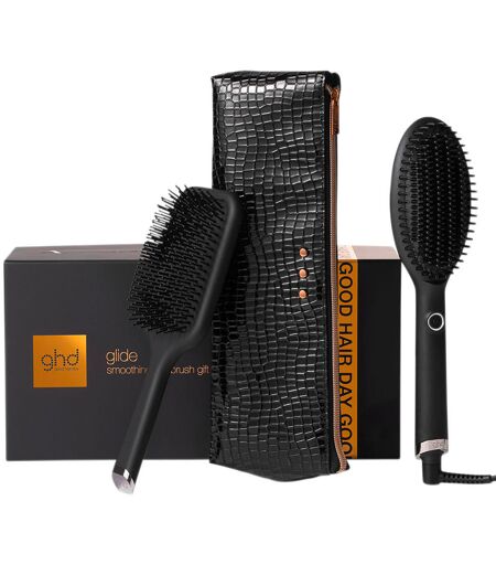 ghd glide geschenkset. Breng glamour naar de feestdagen en geniet van verleidelijke en tijdloze goede haardagen met de ghd glide geschenkset. De ghd glide hot brush wordt geleverd met een ghd the all-rounder - paddle borstel en een hittebeschermende tas ¹. De ghd glide smoothing hot brush is de eerste hot brush van ghd die droog haar snel en moeiteloos temt en glad maakt - je perfecte partner voor styling op de tweede dag. Spring uit bed en creëer een verbluffende look in een handomdraai! Dankzij de dual-action keramische verwarmingstechnologie en ionisator wordt weerbarstig haar moeiteloos getemd zodat je je kapsel in slechts een paar stylingbewegingen kunt opfrissen. Gezondere styling voor de tweede dag: De verwarmingstechnologie handhaaft de optimale styling temperatuur van 185 °C om mooi, zichtbaar gezonder haar te garanderen. De balans van je haar wordt hersteld: De ionen elimineren pluizig haar, waardoor je in slechts een paar stylingbewegingen glad en glanzend haar hebt. Soepel volume: dankzij de dichte plaatsing van korte en langere borstelharen kun je brede secties haar stylen - voor glad haar met natuurlijke beweging, net als een professional. PEACE OF MIND - slaapstand: schakelt automatisch uit na 60 minuten zonder gebruik. Professioneel snoer van 2,7 meter. 2 jaar garantie. De ghd all-rounder borstel ontwart, temt en stijlt lang tot halflang haar zonder statische lading. De brede borstelkop maakt het gemakkelijk om grote secties haar glad te maken en in model te brengen. De hittebeschermingsetui mag alleen worden gebruikt met ghd-producten. ghd glide gladmakende borstel: EU-stekker Automatische slaapstand na 60 minuten zonder gebruik 2,7 meter snoer 2 jaar garantie ghd de allrounder borstel: Brede borstelkop Zacht handvat ...