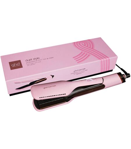 ghd Pink Collectie. De ghd Pink Collection is al 22 jaar een belangrijk onderdeel van ghd, met een sterke missie om borstkanker onder de aandacht te brengen en fondsen te werven voor de goede doelen. Wereldwijd heeft ghd meer dan 24,5 miljoen dollar gedoneerd aan goede doelen voor borstkanker en zet deze toewijding elk jaar voort met een nieuwe Pink Collection. Voor elk verkocht product uit de collectie doneert ghd €10 aan het DKMS look good feel better programma. De ghd duet style™ professionele 2-in-1 heteluchtstyler in roze sorbet met glanzende mokka-accenten wordt geleverd met een hittebeschermingsetui dat ook dienst doet als hittebestendige stylingbasis1. Drogen en stylen met slechts één apparaatAir-Fusion™ technologieDroogstandShine Shot™-modus4 intelligente platen met ultraglanzende coatingLaag geluidsniveauMinder energieverbruikAutomatische slaapstand na 30 minuten zonder gebruik2,7 m lange kabel2 jaar fabrieksgarantie Hoe te gebruiken - 3 stappen voor verbluffende stylingresultaten: 1. prep: breng een ghd heat protection system product aan op handdoekdroog haar - voor perfecte resultaten raden we onze sleek talker stylingolie aan. 2. Droogstand: Houd de tool 2-3 seconden bij de haaraanzet. Glijd dan door de haarlok van de aanzet naar de punten. Herhaal het proces tot je haar helemaal droog is.3 Shine Shot: Activeer de ShineShot™ en style je haar zoals gewoonlijk - DONE! 1 De hittebestendige behuizing en stylingpad zijn alleen voor gebruik met ghd-producten. ...