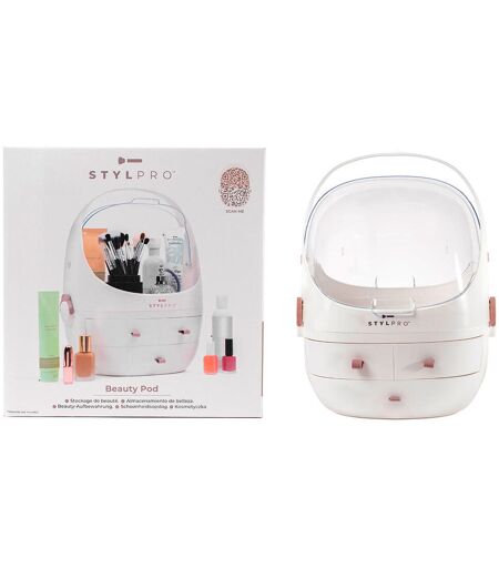Bewaar je favoriete cosmetica op één plek met de STYLPRO Beauty Pod. 4 verschillende opbergvakken voor cosmetica, make-up, toiletartikelen en accessoires in verschillende maten2 x kleinere lades, 1 x grotere ladeTransparant en zichtbaar deksel voor het presenteren van de productenDraagbaar met handvatLichtgewicht ontwerp Ideaal voor gebruik thuis of op reis Grote onderste lade voor STYLPRO reisspiegelsIdeaal om schoonheidsproducten netjes en georganiseerd op te bergenStijlvolle detailsWaterdichtVerwijderbare onderdelen voor reizen en opbergen UW SCHOONHEIDSPOD OPZETTEN 1. Haal het handvat, de lade en de basis uit de doos. 2. Zoek de logo's op het handvat en de tray. Plaats het dienblad in de bodem van het handvat zodat de twee logo's uitgelijnd zijn. Druk het dienblad naar beneden totdat alle randen goed vastzitten. 3. Plaats de nu verbonden lade en het handvat op de basis zodat het logo in dezelfde richting wijst als de lade. 4. Zet de onderdelen aan elkaar vast door de clips aan de zijkant van de lade omhoog te klappen tot ze vastklikken. Je kunt deze twee delen dan samen of apart opbergen zoals je wilt. ...