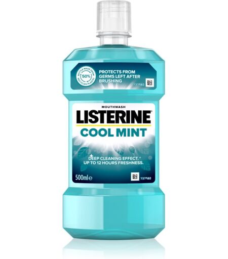 Listerine Cool Mint, 500 ml, Mondwater & Spray Unisex, Het mondwater Listerine Cool Mint verfrist niet alleen de adem maar bestrijdt ook tandplak en helpt het tandvlees en de tanden gezond te houden. Kenmerken: bescherming tegen tandplak behoudt gezond tandvlees vernietigt bacteriën zorgt voor frisse adem Hoe te gebruiken: Spoel na het reinigen van de tanden de mond met mondwater gedurende de tijd die aangegeven staat op de verpakking en spuug vervolgens uit. ...